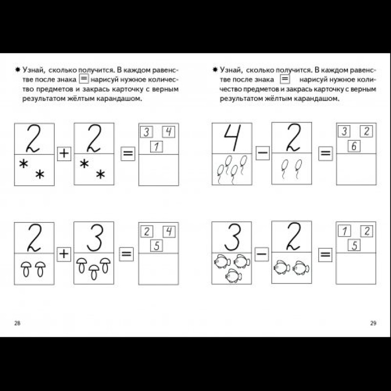Предлагаем Вашему вниманию задания для развития математических способностей у детей 4-5 лет. Для развития вычислительных навыков ребенок изначально должен понять смысл действий сложения и вычитания, уметь соотносить математические знаки «плюс» и «минус» с этими действиями. Данную задачу и выполняют задания нашей тетради, они сориентированы на особенности восприятия детей этого возраста и развивают у них новый, более высокий уровень мышления — наглядно-образный, который в дальнейшем переходит в образное мышление.