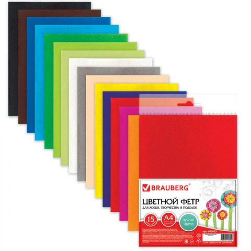 Фетр цветной для творчества А4 210*297мм. 15л., 15цв., толщ. 2мм, Brauberg