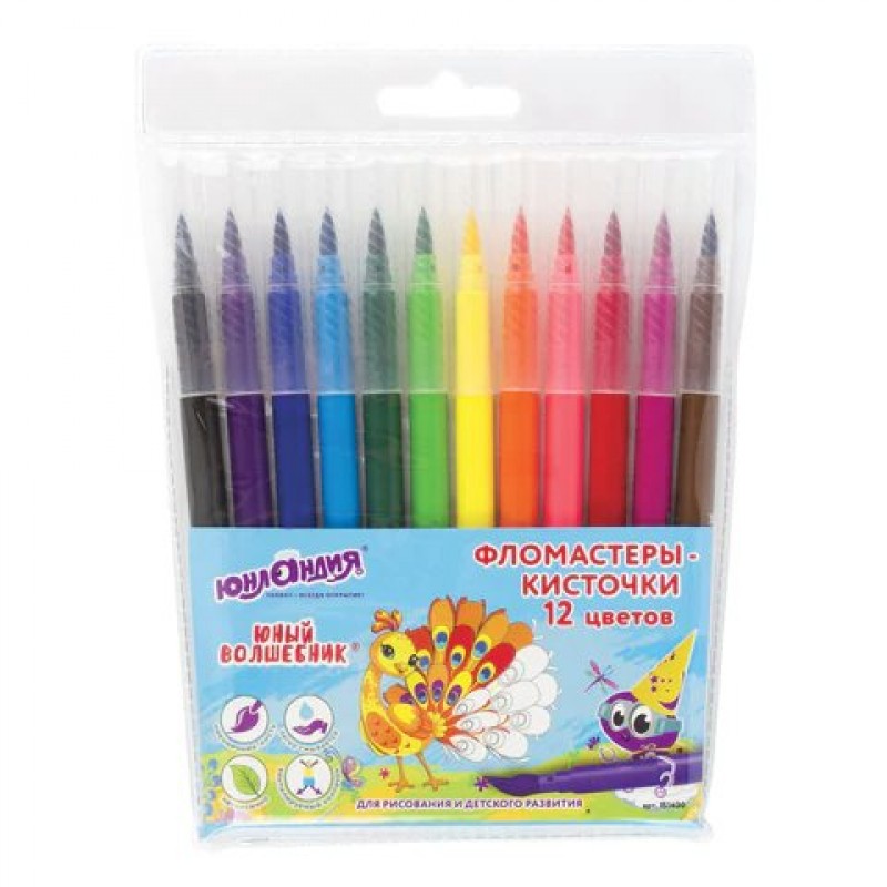 Фломастеры 12 цв. круглые с кистью "ЮНЫЙВОЛШЕБНИК", вентилируемый колпачок ЮНЛАНДИЯ