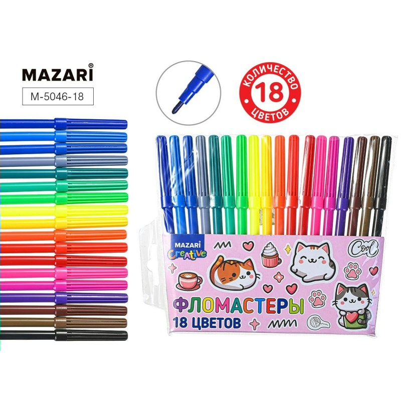 Фломастеры 18 цв. круглые КОТИКИ, вент.колп., ПВХ-упак. Mazari
