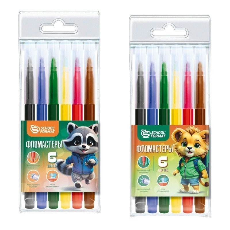 Фломастеры 6 цв круглые ЯРКИЕ ЗВЕРЯТА, классические, смываемые Schoolformat