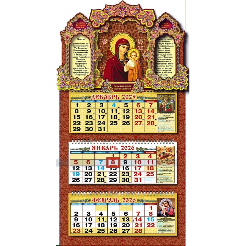 Календарь квартальный объемный Казанская икона 2026г. 333х635 мм