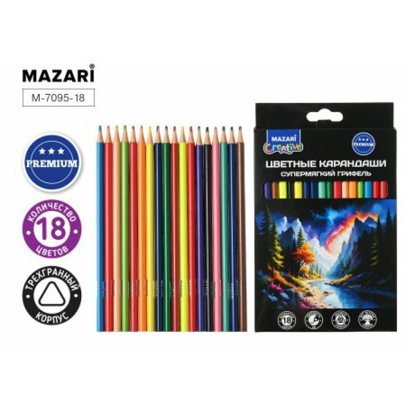 Карандаши 18цв. пластик мягкие, трехгранный корпус, d грифеля=2,8мм. Mazari