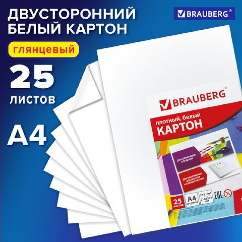 Картон белый 25л. А4 ,МЕЛОВАННЫЙ, (белый оборот), Brauberg