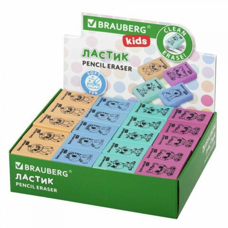 Ластик прямоугольный KIDS "Школьный", 26х17х7 мм,пастельные цвета ассорти Brauberg