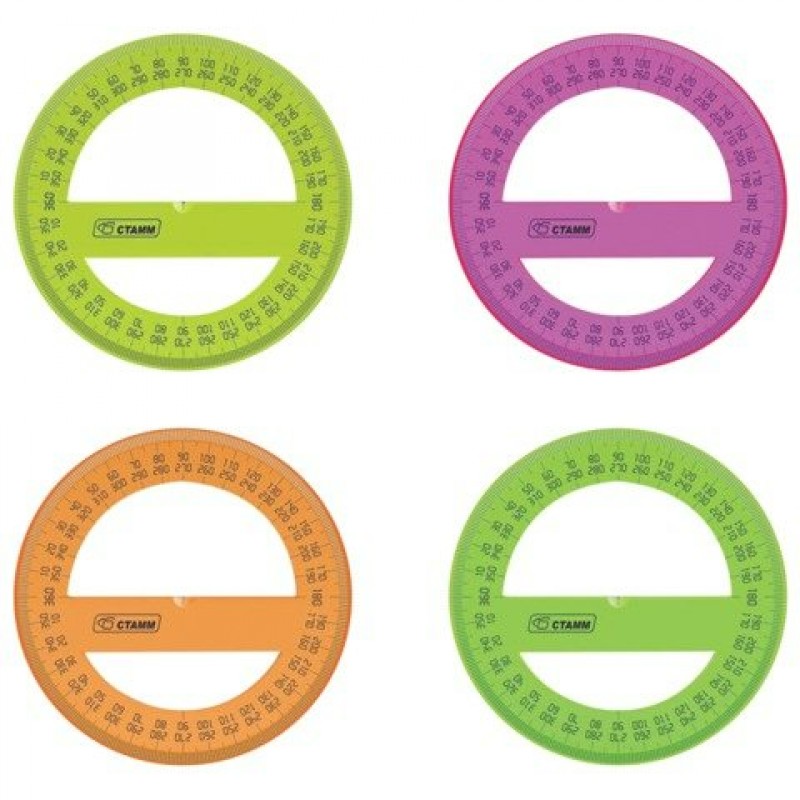 Линейка транспортир пласт. 12см 4цв. 360гр. флюор. круглый Стамм