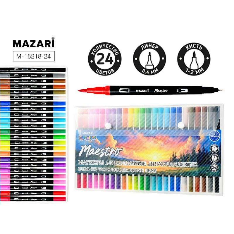 Маркер акварельный набор 24цвета MAESTRO,кистевидн./файнлайнер Mazari