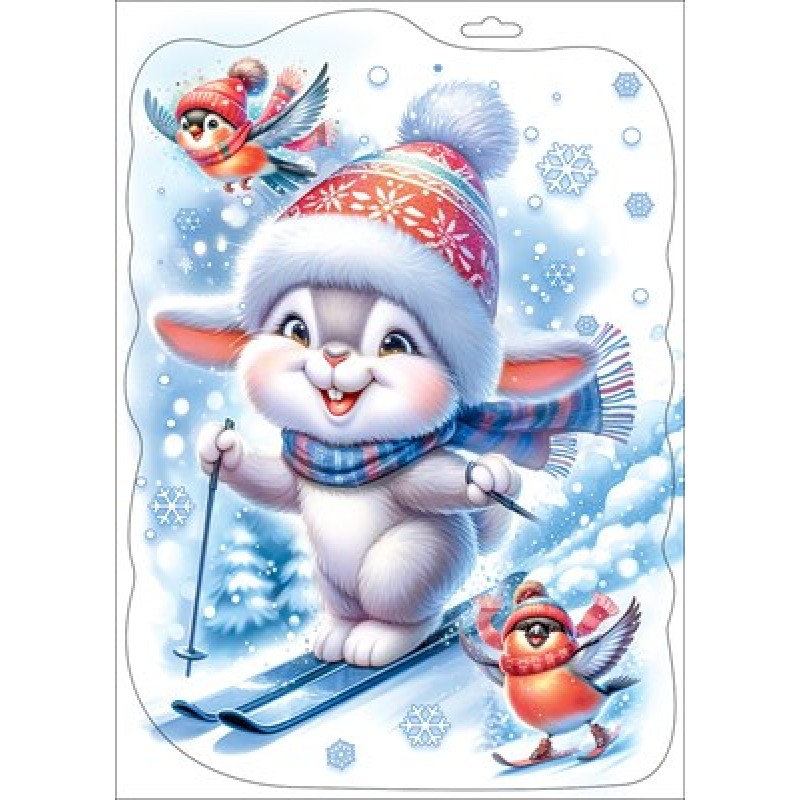 Наклейка Двусторонняя "Зайчик и снегирь на лыжах" 332х237 мм