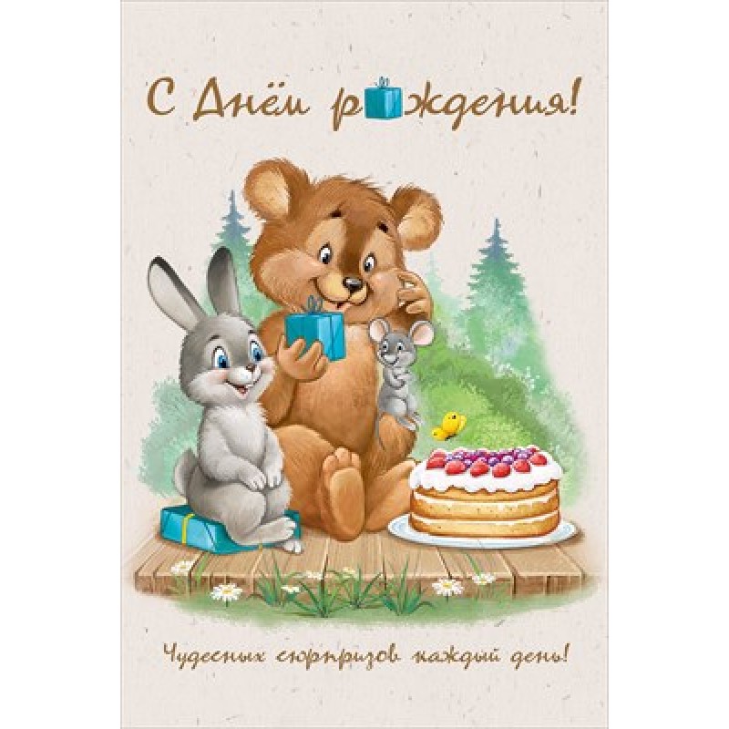 Открытка "С Днем Рождения!" (заяц, лис и еж с подарками) 122х182 мм