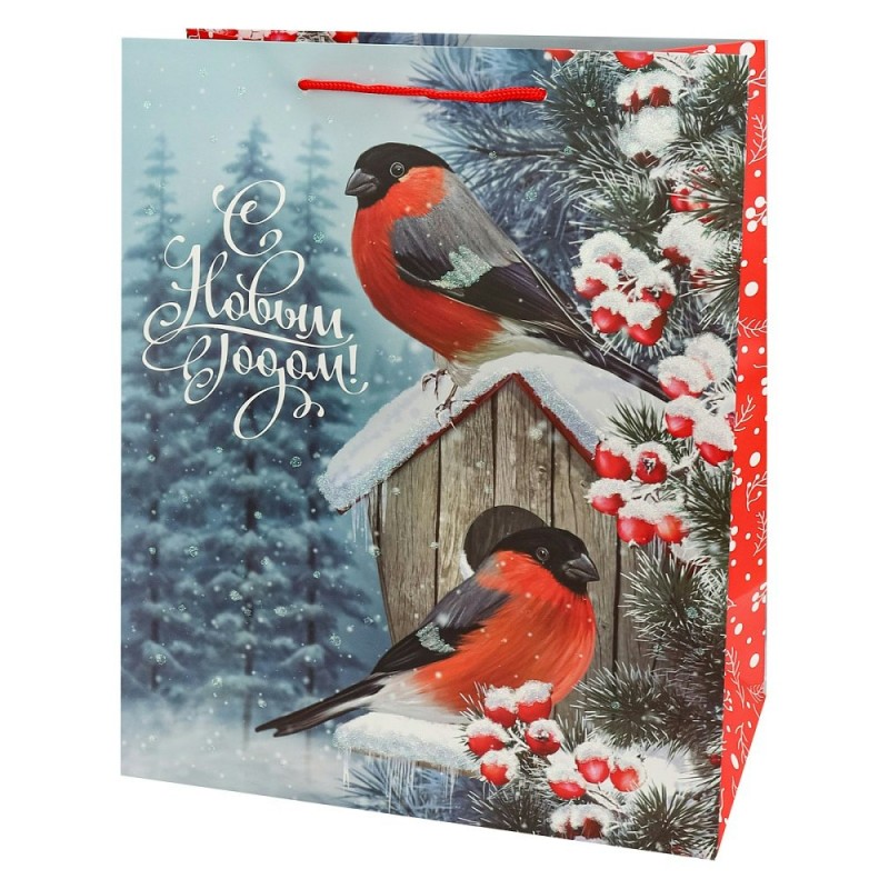 Пакет Бумажный плотный с блесками Снегири НГ 26х32х10 см (L)