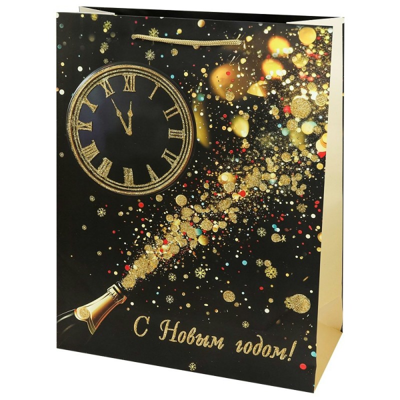 Пакет Бумажный плотный с блестками Куранты НГ 31x40x12 см (XL)