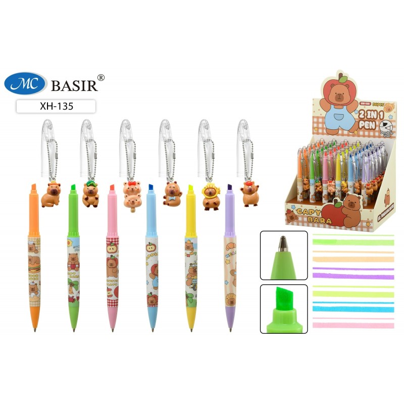 Ручка шариковая синяя 2в1 "КАПИБАРА"с поворотным механизмом+текстовыделитель, с брелоком
