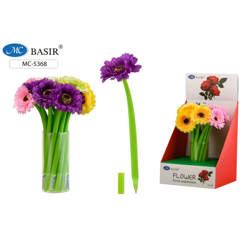 Ручка шариковая синяя "ГЕРБЕРА" прорезиненный корпус зелёного цвета, наконечник цветок BASIR
