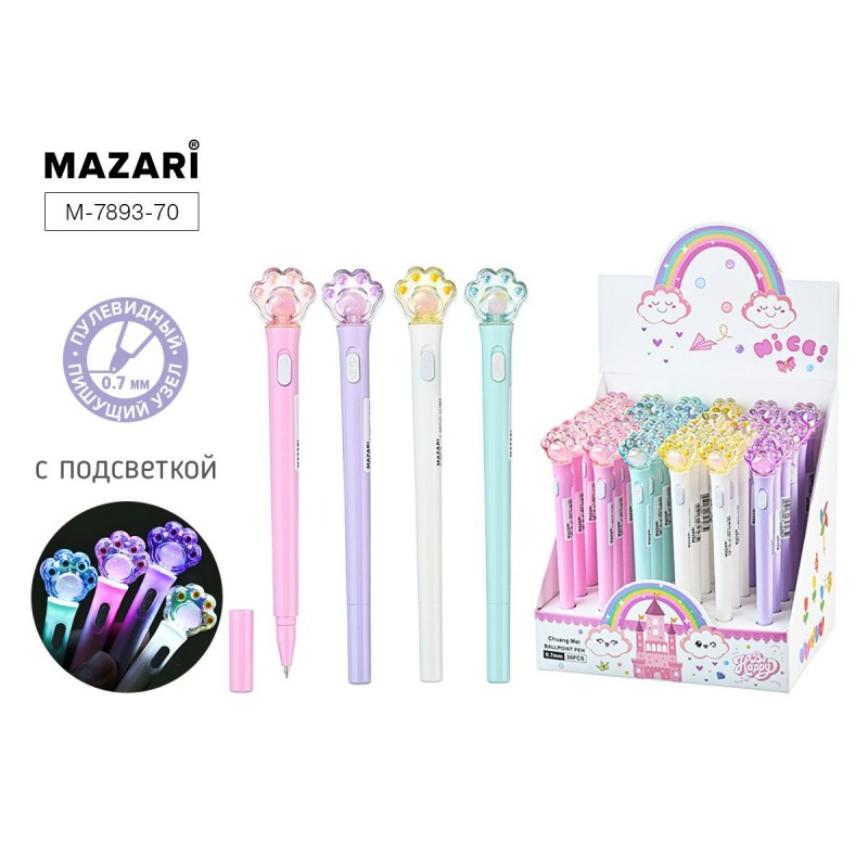 Ручка шариковая синяя ЛАПКИ, с подсветкой, пулевидный пиш.узел 0.7мм, Mazari