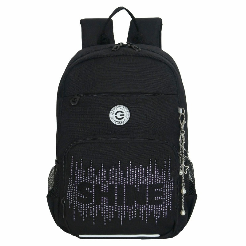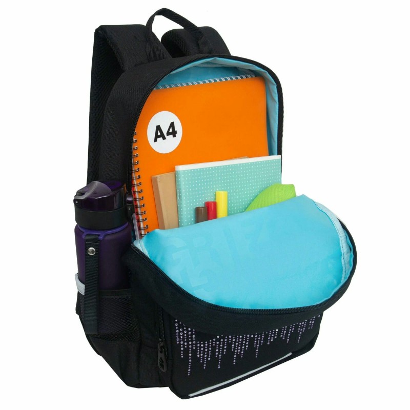 Рюкзак школьный черный - серебро, с карманом для ноутбука 13", анатом.спинкой, Grizzly
