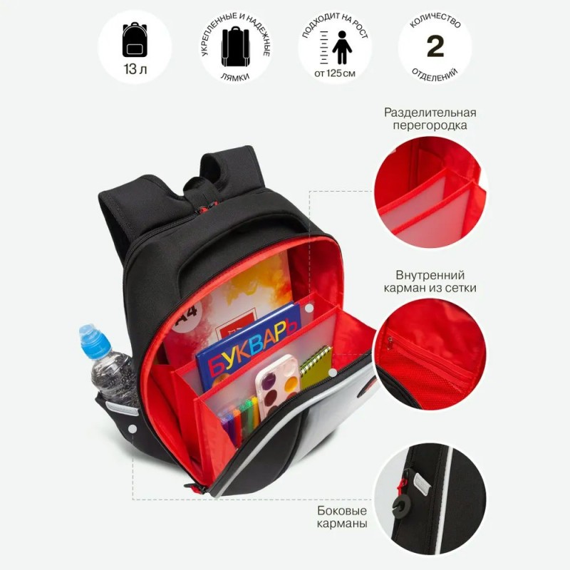 Рюкзак школьный черный,26*37*16см черный, 1 отделение, эргоном. спинка Grizzly