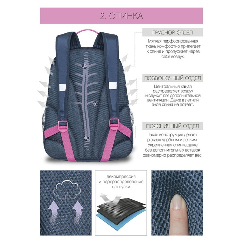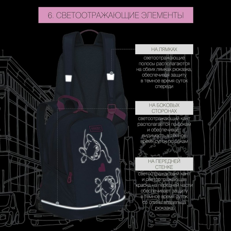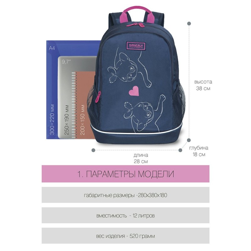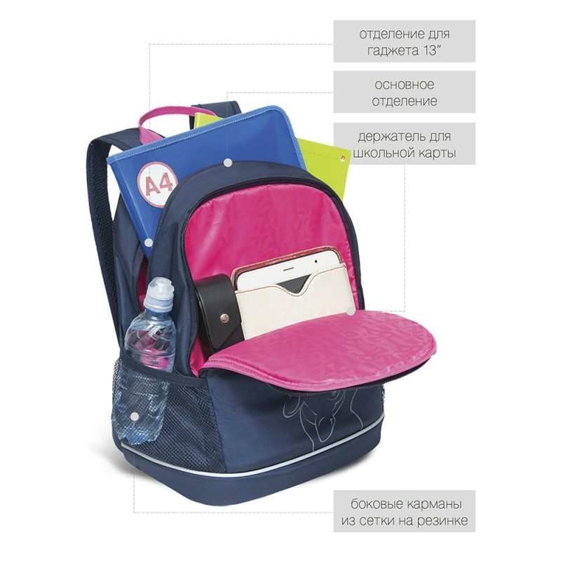 Рюкзак школьный темно-синий,28*38*18см, 2 отделения, 2 кармана, уплотненная спинка Grizzly