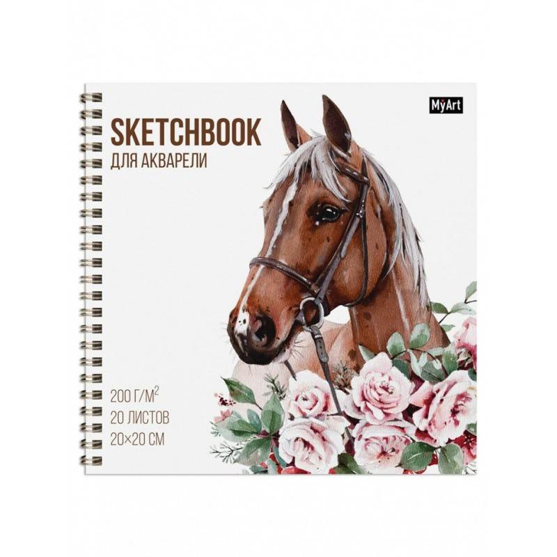 Скетчбук 205*200 мм. спираль MyArt.для АКВАРЕЛИ.ЛОШАДЬ В ЦВЕТАХ,20стр, Проф-Пресс