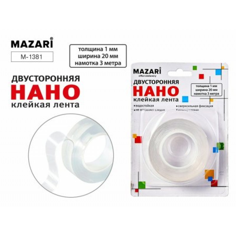 Скотч 20мм.*3м. прозрачный (клейкая двусторонняя , НАНОСКОТЧ, толщина 1мм. Mazari
