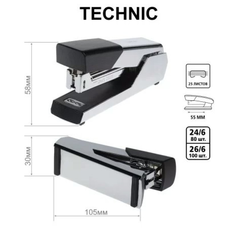 Степлер №24/6+26/6 Technic 25л, хром,металлический, 25 л. Hatber